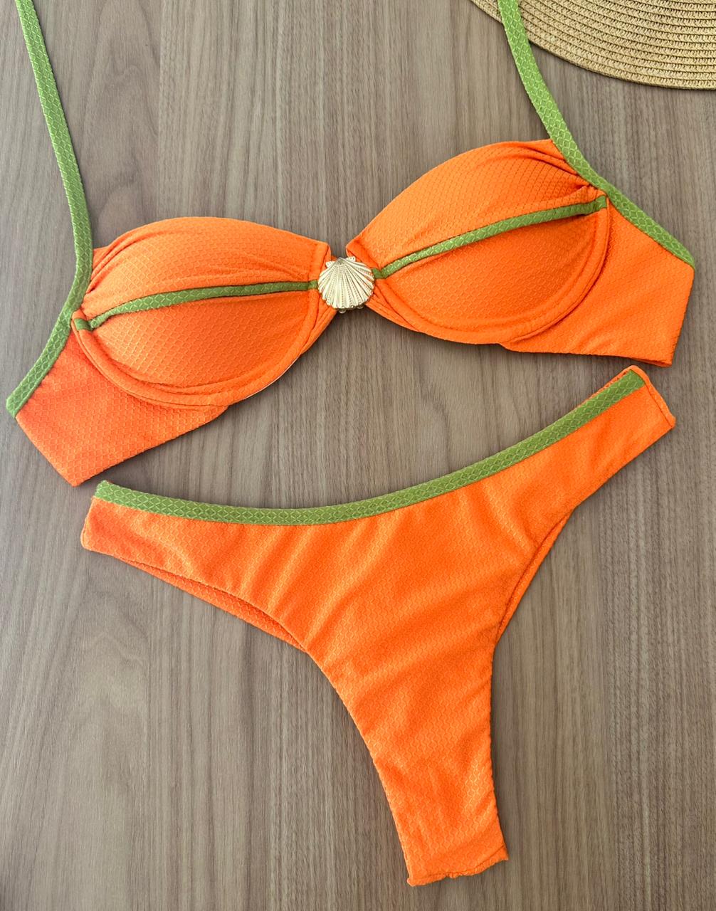 Detalhes: Top com bojo removível e alças ajustáveis com detalhes na cor verde e metal em formato de concha.